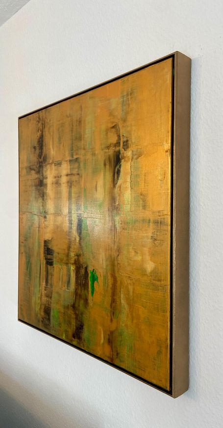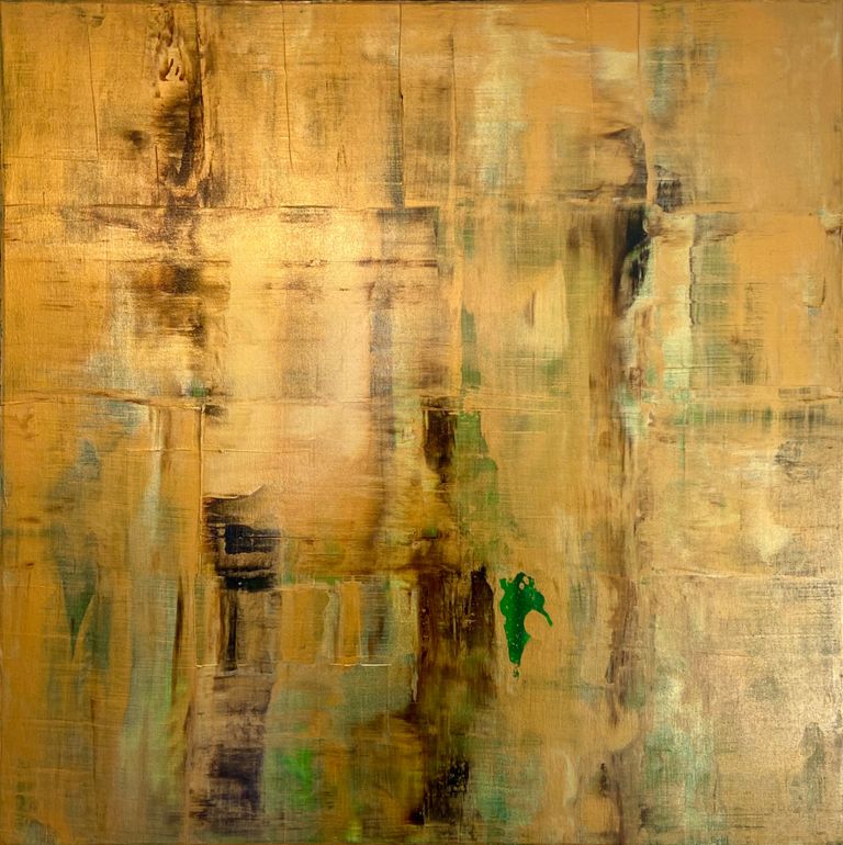 Abstrahierte Waldlandschaft in harmonierenden Gold- und Braunmischtönen. Je nach Lichteinfall verändert sich die Intensität und Reflexion des Goldes. Wunderschöner Farbverlauf mit feinsten Strukturen.